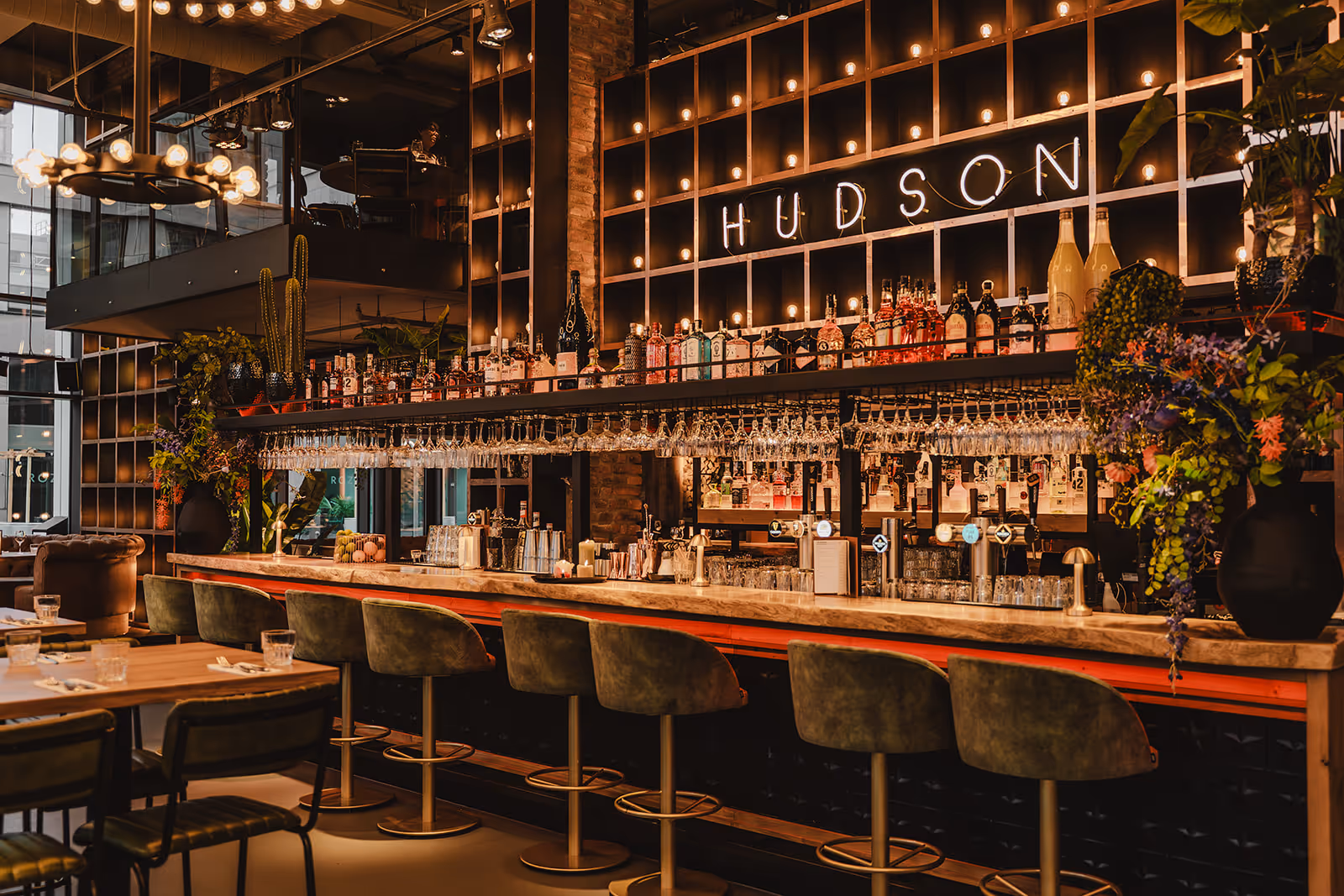 Hudson Den Haag Centrum is de nieuwste Hudson-vestiging en heeft meteen de lat hoog gelegd. Meterslange Chesterfield banken, houten wanden, pop-art muurschilderingen en een custom stalen kroonluchter met 129 lichtbronnen, ontworpen speciaal voor deze locatie. Vanuit de open keuken worden de gerechten met passie bereid.